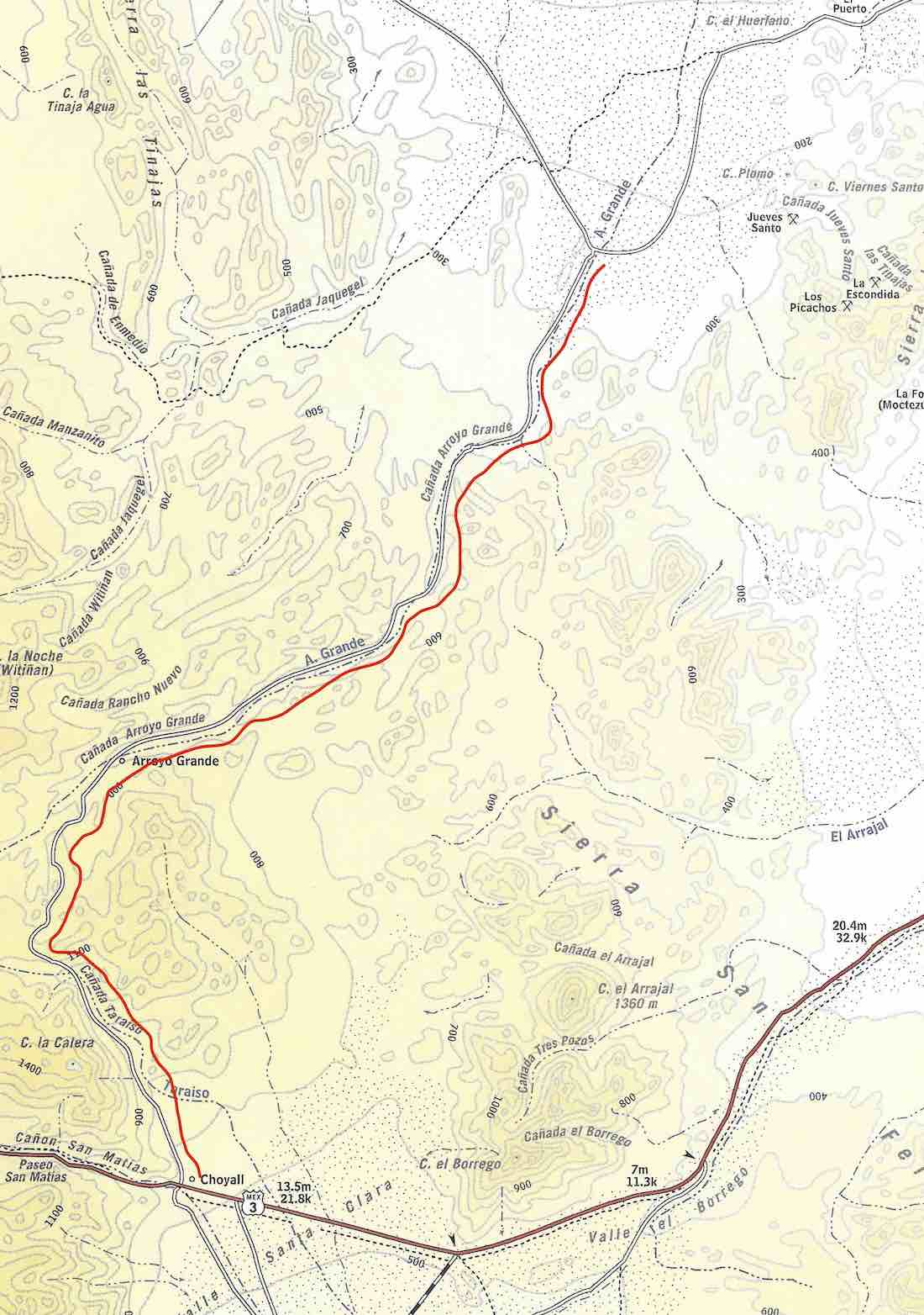 Baja Almanac, it looks like this route through Arroyo Grande will connect us up to Highway 3 (see red line along route) .. However from looking at