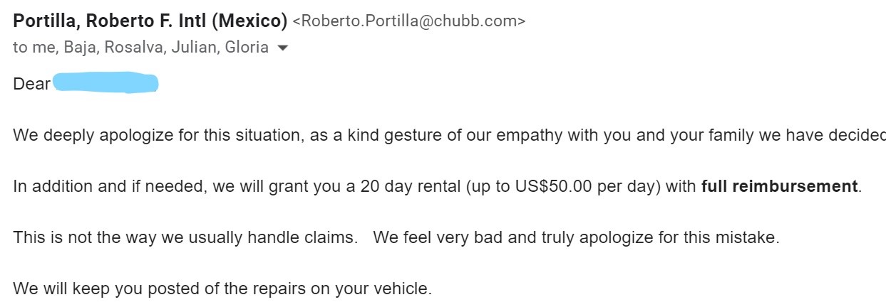 next representative sent me an email saying that this is not how Chubb does business and stating that Chubb would reimburse me for $1000 in car rental
