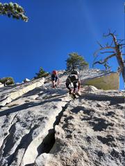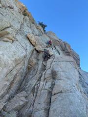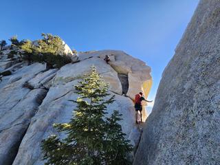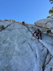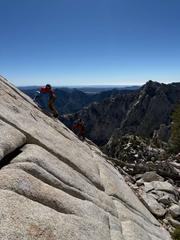 Now, almost everyone continues straight up, on a smooth granite slab/dihedral called "Wall Street" to the North summit, which is slightly higher than