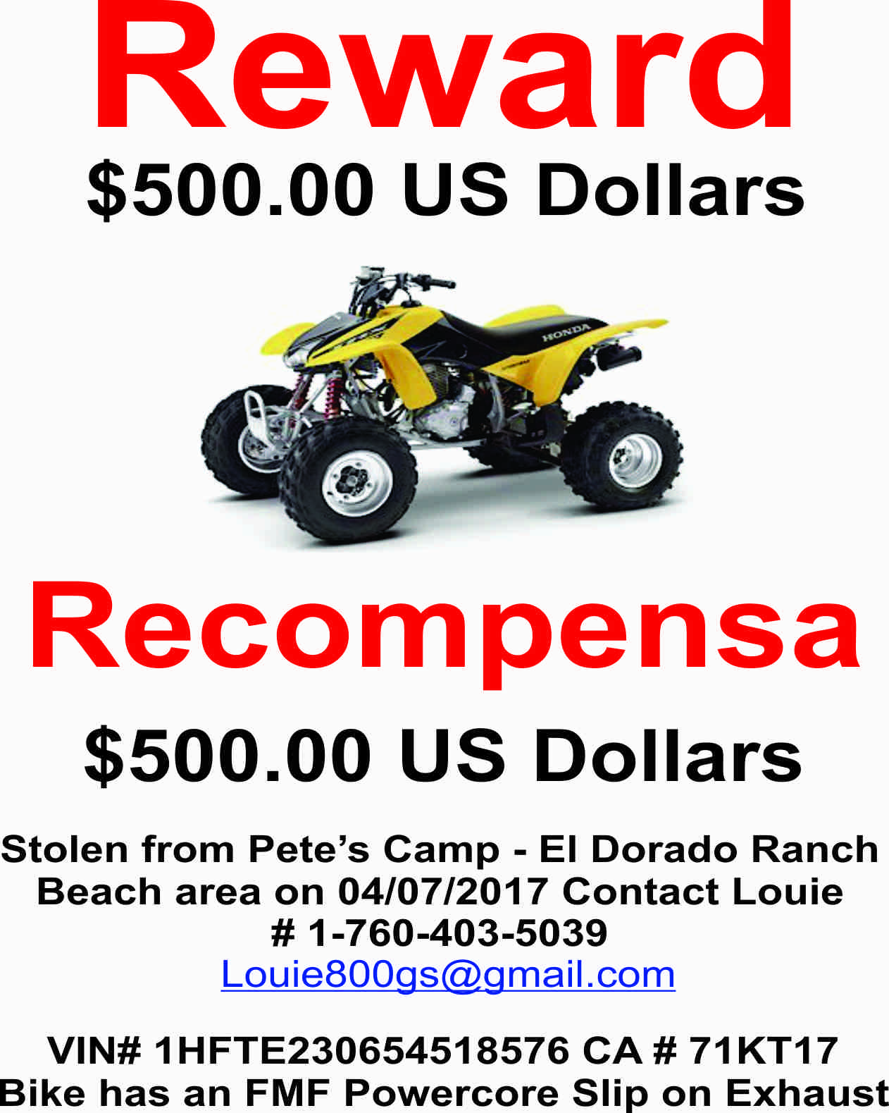 OP: You should offer a reward for the ATV. Let the police know there is a "recompensa". They will get a little more interested.