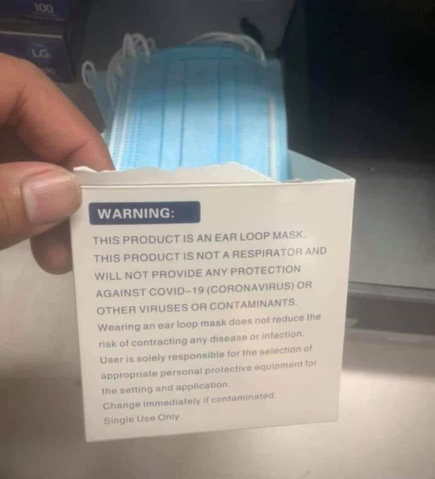 The masks pictured above are not the kind that effectively protect wearer and others....hence the label info..... there are a range of mask types....