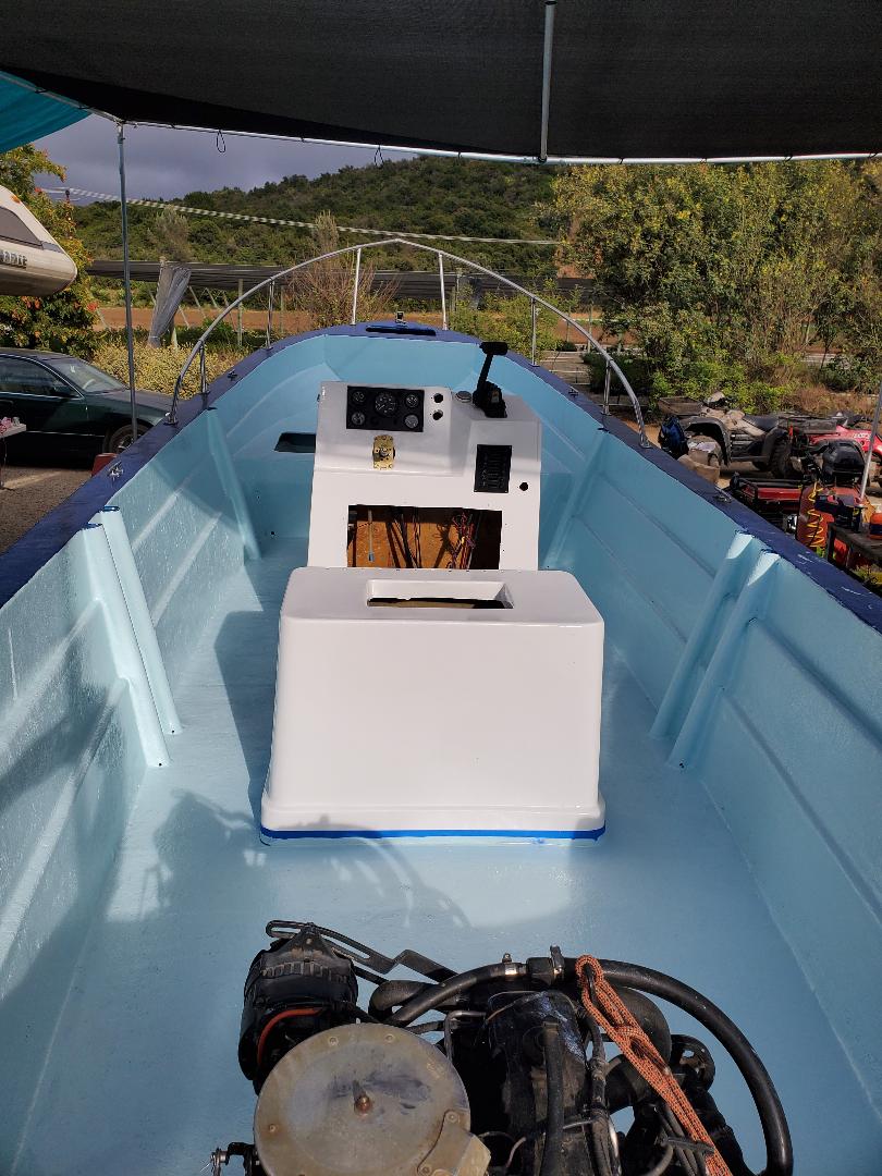 aluminum cleaned up, lots of glass work on the console, built in bait tank, etc etc new Garmin sounder, Icom radio it will soon be ready and 3 coats