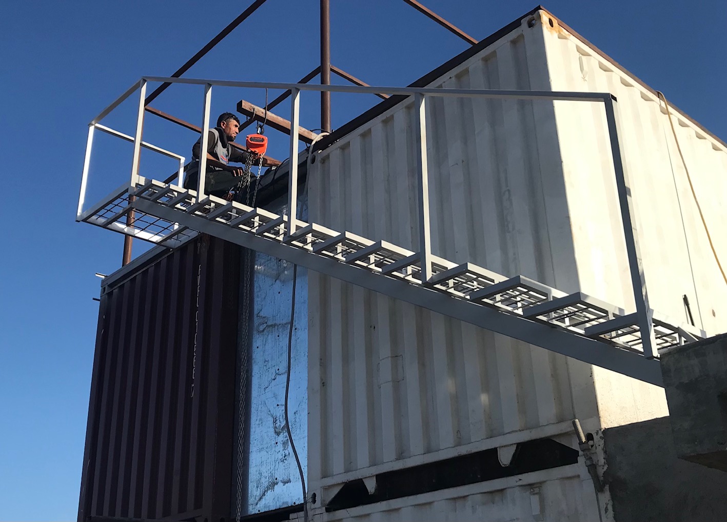 The stairs were fabricated onsite, painted and hoisted into place today! The railing will be cable and the steps concrete.