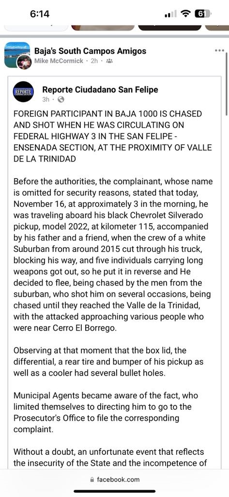 Anyone have further info on the (Baja 1000 race)chase truck shot up by cartel members near Valle de Trinidad yesterday? Sounds like the driver and