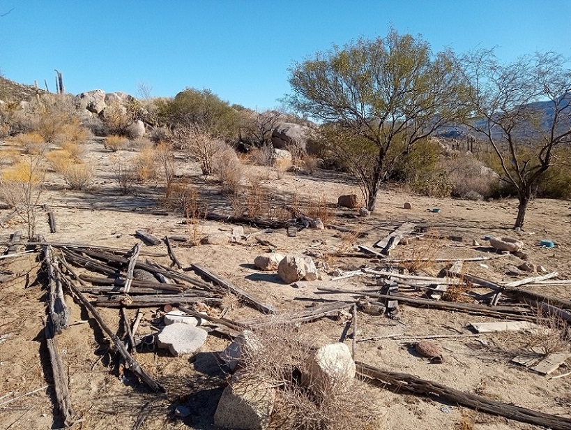 A century later Crosby says “To heighten the effect, the ranch house was poor and primitive in the extreme.” (The King's Highway In Baja California, page 140). The ranch house is long gone, with just some artifacts scattered about and items that are still used by the occasional visiting cowboy are hanging in a mesquite tree.