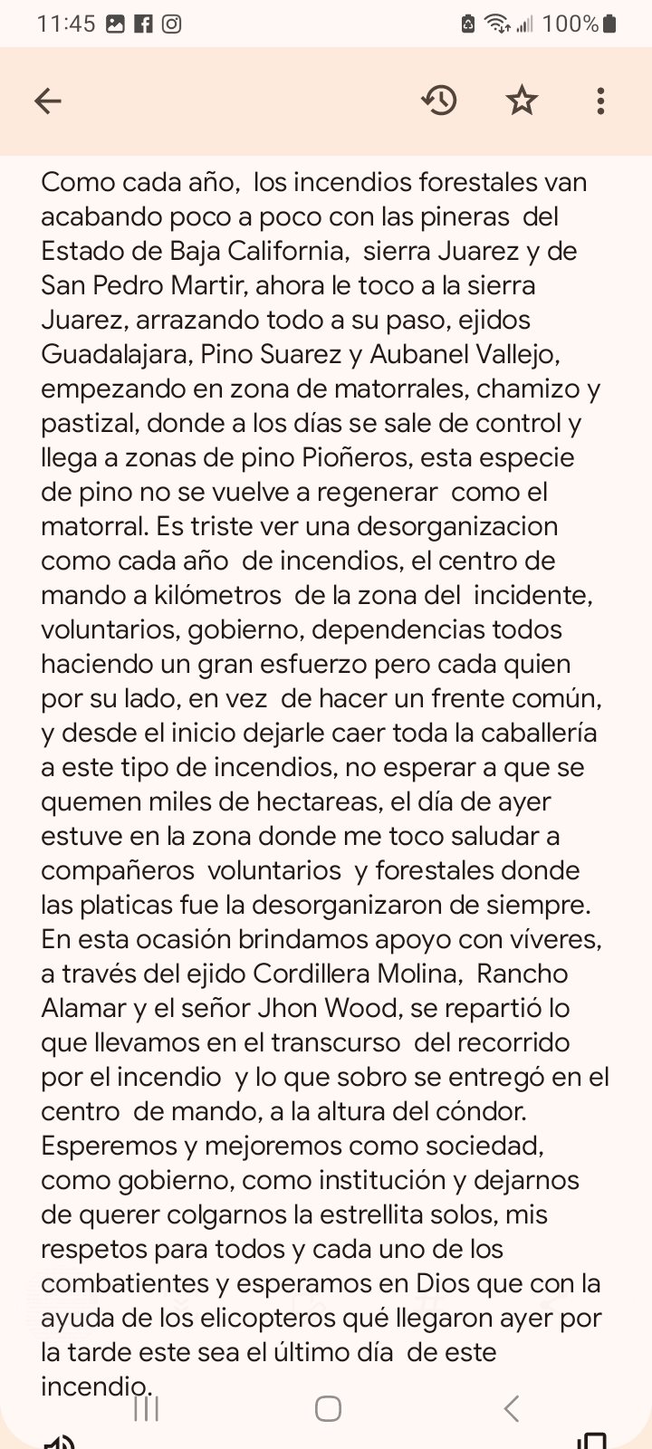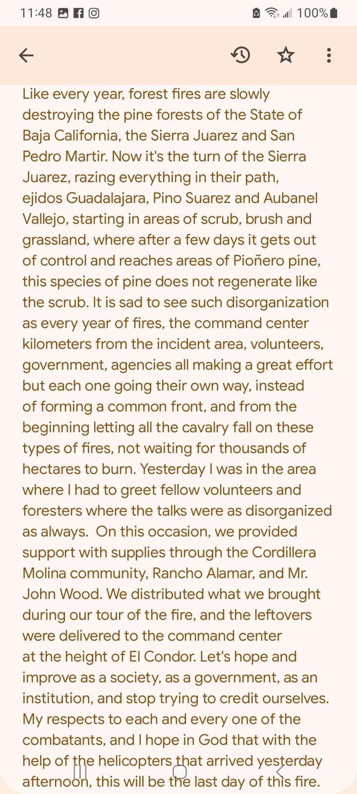 This post today from a friend who is assisting firefighters in La Rumorosa. Screenshot w/ translation to English: