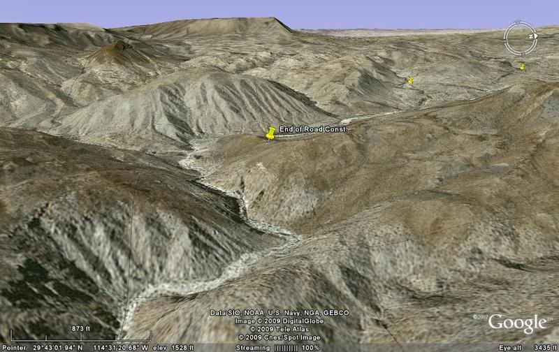 0.8 miles from above, park at huge boulder: 29°41.68'/ 114°28.20' (marked as 'End of Road' on Google Earth image in next reply)