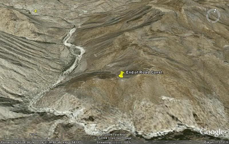 (End of bulldozed road, on canyon ridge: 29°43.033'/ 114°31.556' elev. 1,615' )