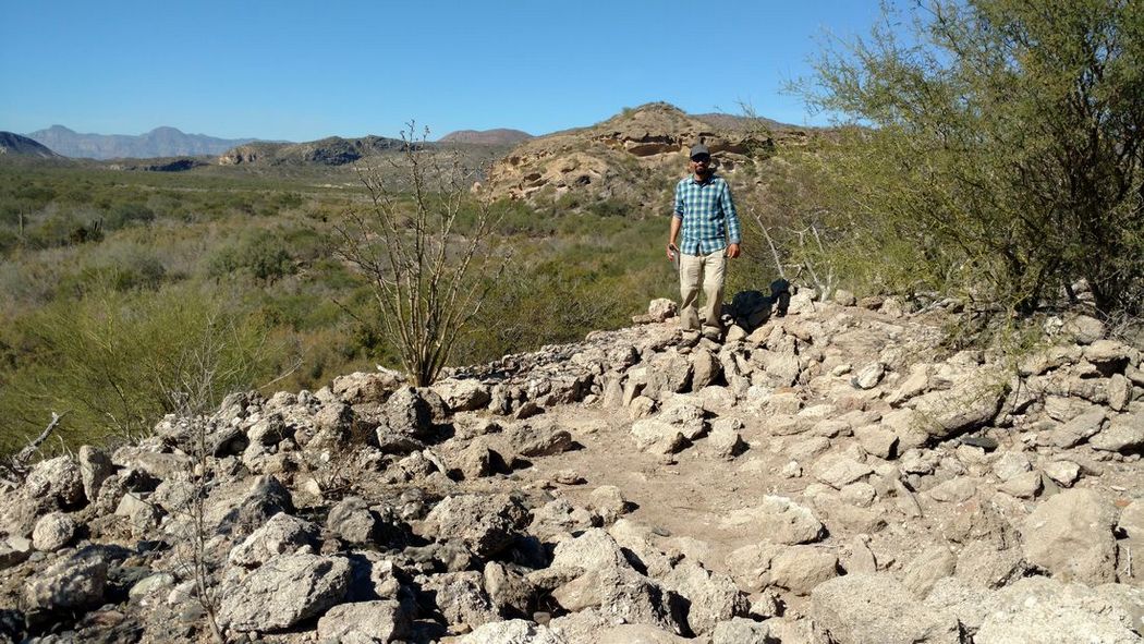 On the other side we followed the dirt road, winding among the bufa (bunchgrass), matacora, torote, copal, frutilla, mesquite, and pino salado (salt cedar, an invasive species). As we neared the site, a distinctive whitish hill loomed closer. The soil here is marine sediment—full of shells, and ideal for burning to make “cal” for mortaring stones together to build a structure.