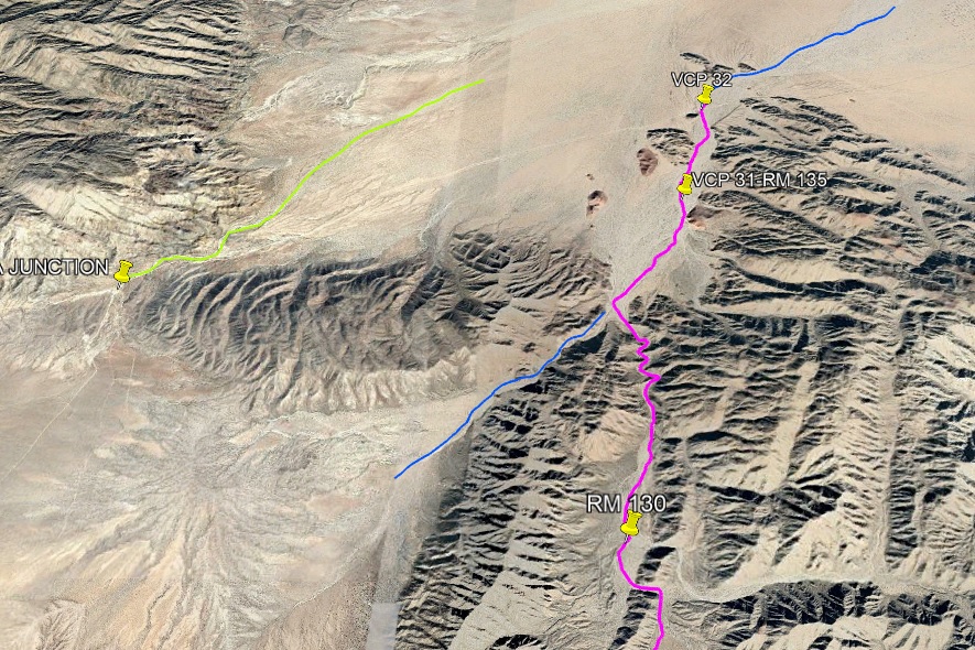 north south arroyo exiting Arroyo Grande track at N31-37.472’, W115-15.538’ and leads E to another wash route south to Borrego. This one is